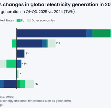 Ember reports that in the first nine months of 2025, fossil fuel generation declined by 17TWh, a 0.1% decrease over the previous year, and it expects no growth in fossil fuel output for the entirety of 2025. This would end a trend of increasing fossil fuel generation seen each year since 2021, and would mark just the fourth year since the year 2000 that fossil fuel generation did not increase over the previous year.