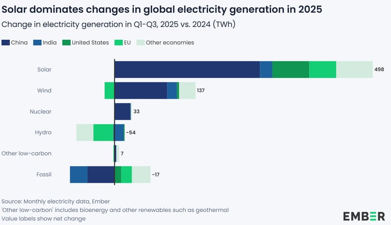 A graph showing changes in electricity generation across markets and technologies. Image: Ember.